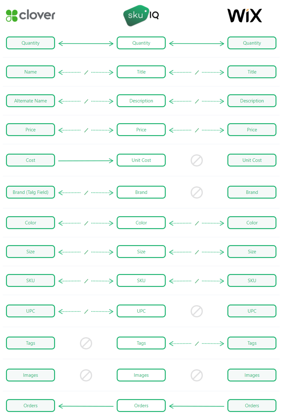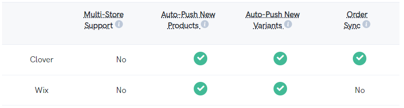 Based on selecting Clover and Wix as your platforms, SKU IQ supports the following features: