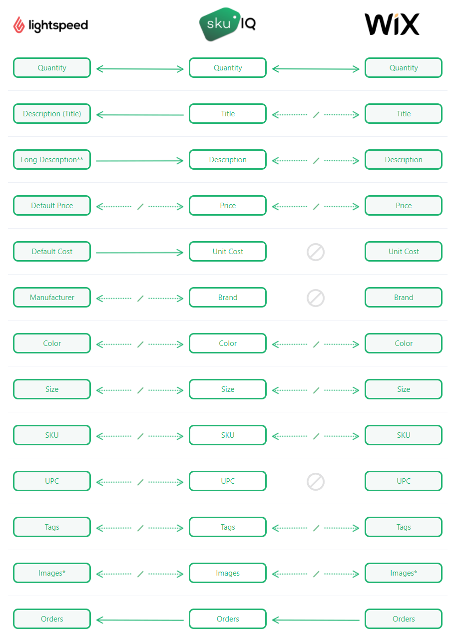 Fields with this symbol require a “source of truth” to be selected – either the POS or the eCommerce platform. The master platform will push changes to the other platform. No changes from the other platform will sync. For example, if POS is the master platform, changes to the description field made on the POS will push to the eCommerce description field, but changes made on the eCommerce platform to the same field will not reflect on the POS. If a double arrow is shown only on one side of the chart, it means unidirectional syncing is available only between that platform and SKU IQ.