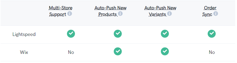 Based on selecting Lightspeed and Wix as your platforms, SKU IQ supports the following features: