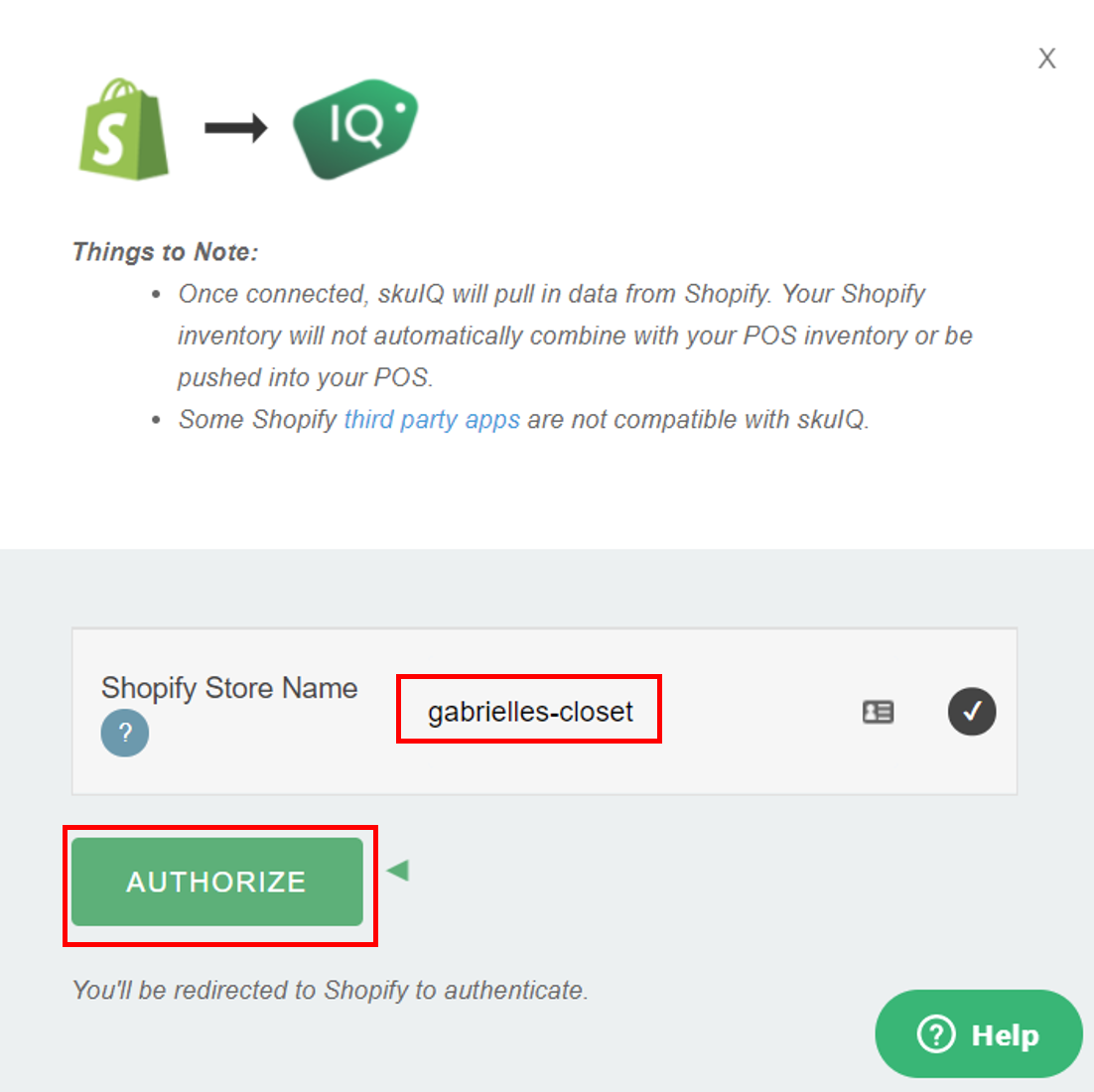2.Type your Shopify store name without the suffix “.myshopify.com.” For example, if your store’s URL is “my boutique.myshopify.com,” you will only type “my-boutique” into SKU IQ.