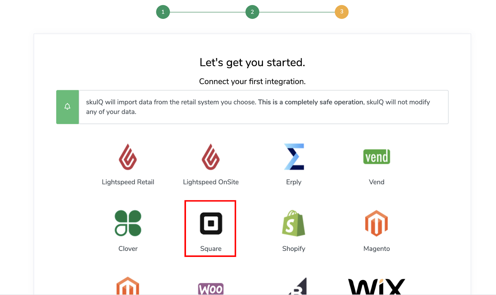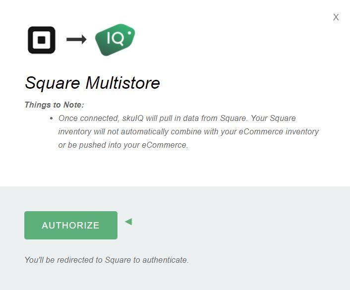 10.Square is now connected with SKU IQ. SKU IQ will begin automatically detecting and importing your Square products and inventory into the SKU IQ Products menu. No changes will happen with your data at this point. You can now proceed with connecting your eCommerce platform. Or, if you have more than one Square POS, you’ll need to contact SKU IQ for help with completing your multi-store Square connection.