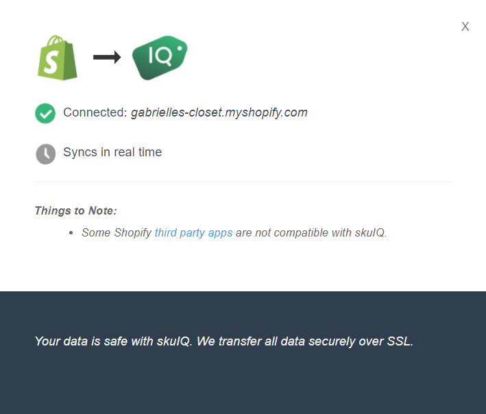 7.Shopify is now connected with SKU IQ. SKU IQ will begin automatically detecting and importing your Shopify products and inventory into the SKU IQ Products menu. No changes will happen with your data at this point. You are now ready to begin syncing your inventory between Square and Shopify.