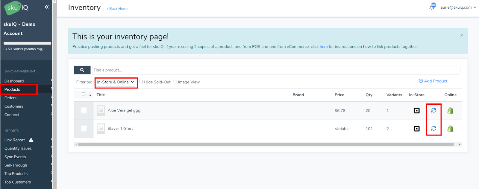 8.After your products are linked, you can view them by going to Products, and then filtering on In-Store & Online. A sync symbol displays when the items are linked.