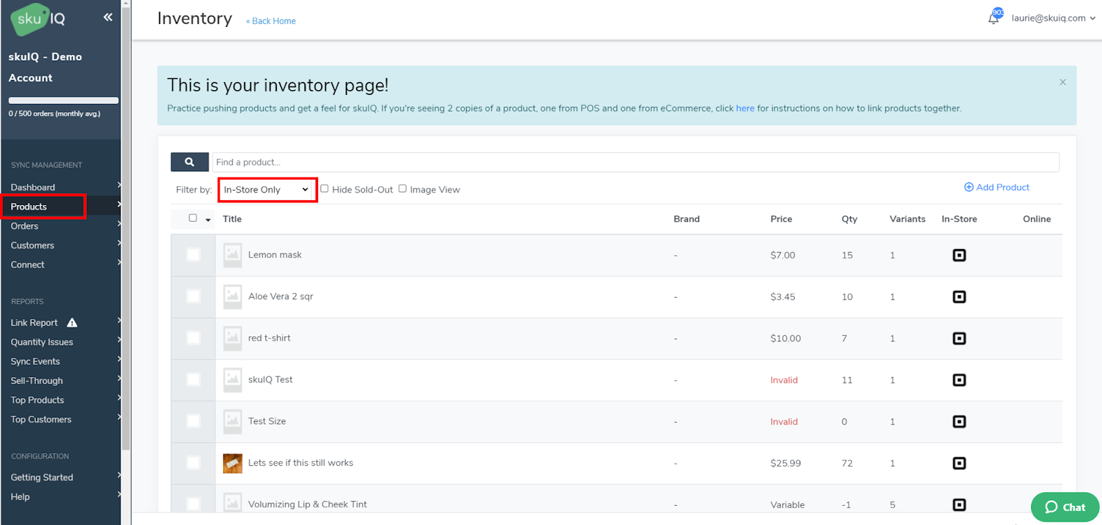 When you first connect your POS and eCommerce platforms to SKU IQ, your In-Store and Online items will populate in the Products list. If there are products in your eCommerce that do not exist in your POS platform, you can push products from Shopify to Square so they will be available for sale in your retail store.