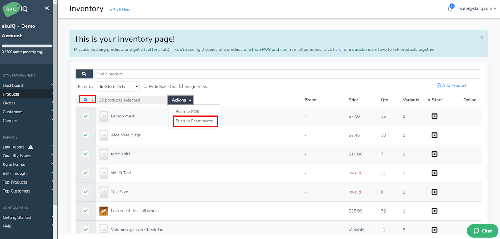 Note: We recommend that you do a test product push prior to migrating all your products to ensure you are comfortable with the syncing capabilities and data that is migrated. Once items are pushed, those products will be available on your eCommerce platform and SKU IQ will sync your inventory quantities. You can test our system by pushing one or two products initially before pushing a whole page of products.