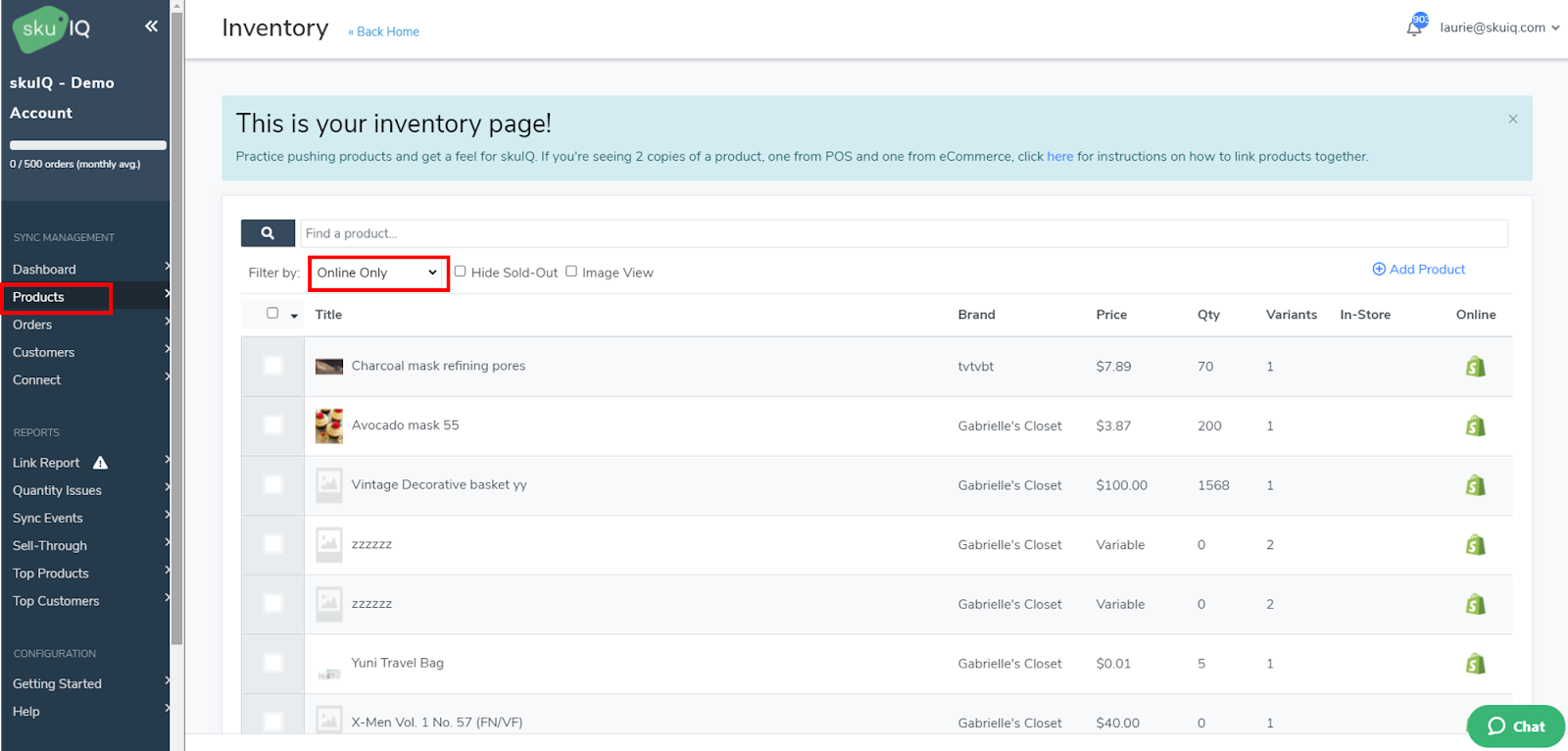 When you first connect your POS and eCommerce platforms to SKU IQ, your In-Store and Online items will populate in the Products list. If there are products in your POS that do not exist in your eCommerce platform, you can push products from Square to Shopify so they will be available for sale online.