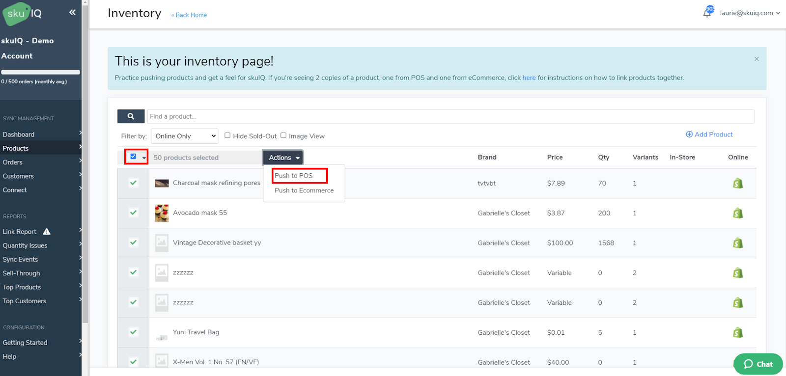 Note: If your POS and eCommerce have a lot of the same products, please link your products before proceeding to push products. If you push products before doing an inventory merge, you might create duplicate products.