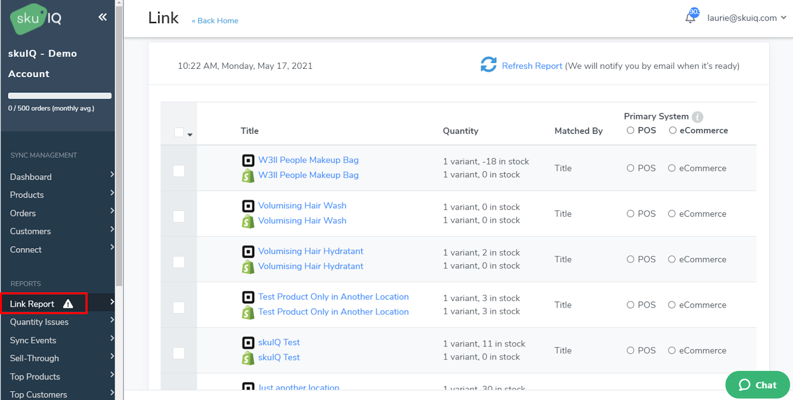Link reports are generated when there are matching products in both of your platforms and the inventory quantities need to be synced. Linking products enables SKU IQ to associate the same product that exists in both systems together, in order to then (after being linked) sync quantities in real time.
