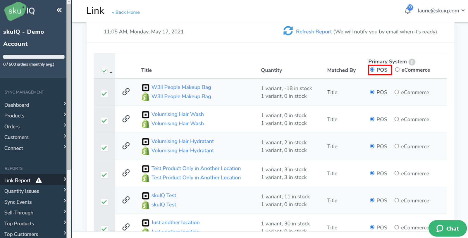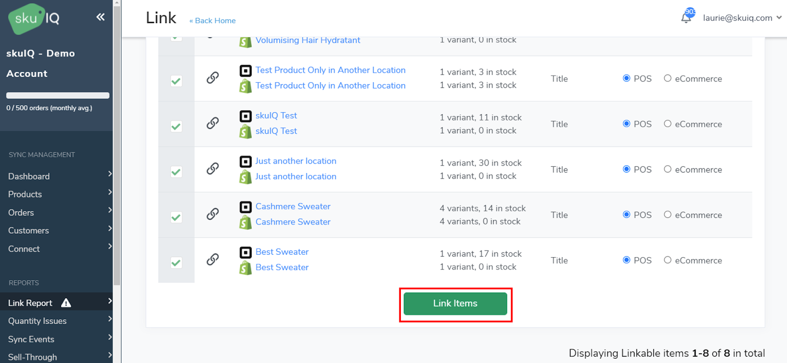 If SKU IQ finds matching product attributes between your POS and eCommerce platforms, a link report will be automatically generated after you’ve successfully connected your POS and eCommerce platform with SKU IQ. The Link Report is where you’ll merge your items so they can be in sync.